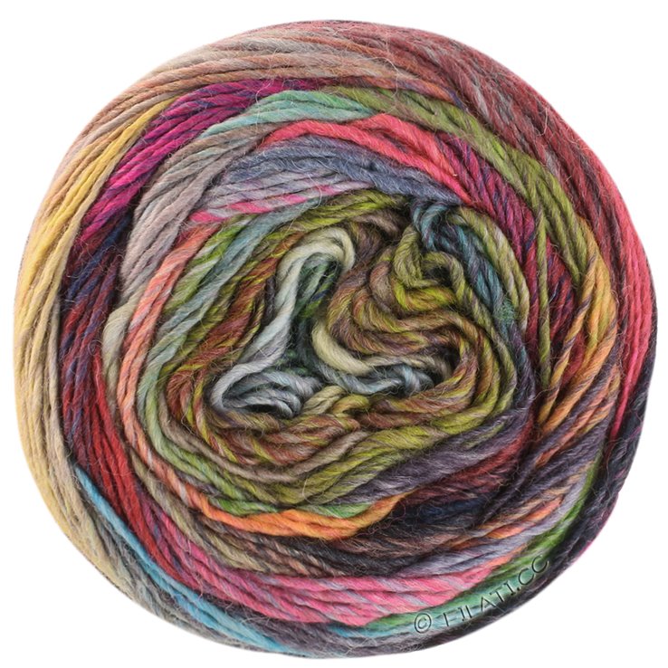Dette er noget så sjældent som en selvstribende garn i 100% merino uld. Normalt er selvstribende garner fulde af polyester eller akryl. Ikke at der er noget galt i det, men dette garn er altså egnet til dem, som gerne vil undgå kunststof. Man bliver fuldstændig bidt af at strikke med dette garn - især hvis man strikker det sammen med en anden selvstribende kvalitet som fx. Knitcol. Så får man et look som minder om det, du kan se i t-shirten Sea Glass tee af Wool and Pine på Ravelry, blot meget lettere, da man ikke hele tiden skal skifte farve fra maske til maske. Det er umuligt at stoppe igen, når man først er i gang, fordi hver pind byder på nye farvekombinationer. Strikker man Colorissimo alene, vil resultatet være tilfældige striber i farverne: neon pink og orange med klare mørke farver 07 eller neon pink og gul med pasteller 011.