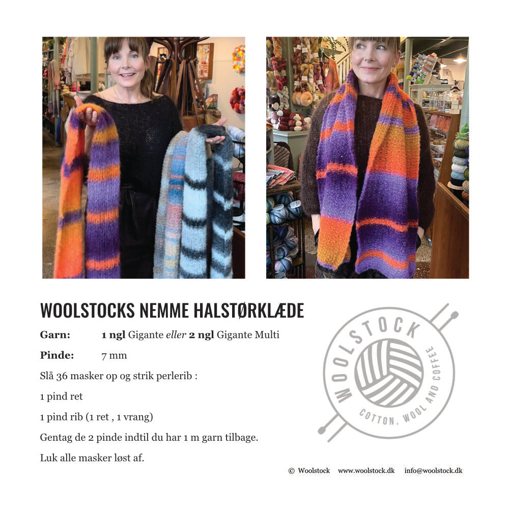 Vi bruger bare et nøgle Gigante eller 2 nøgler Gigante Multi til Woolstocks nemme tørklæde på pind 7mm. Opskriften kan du downloade gratis her på siden. Den ligger under opskrifter.