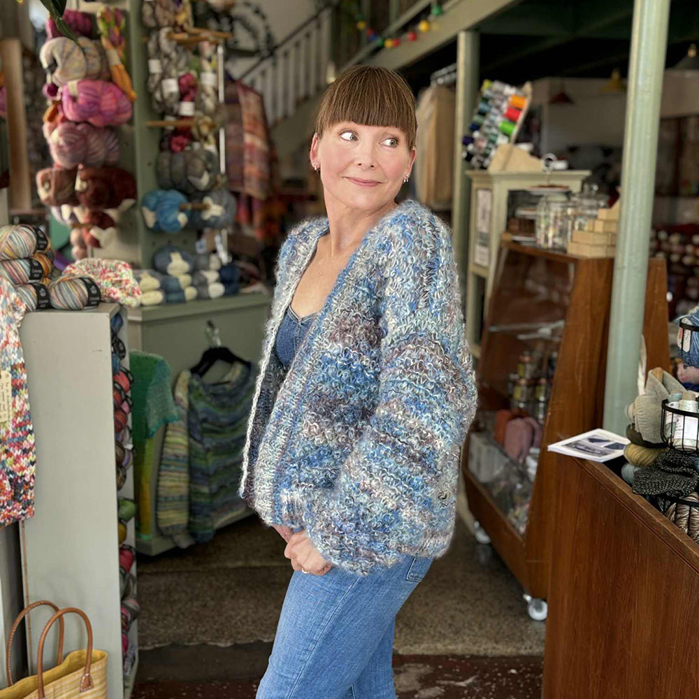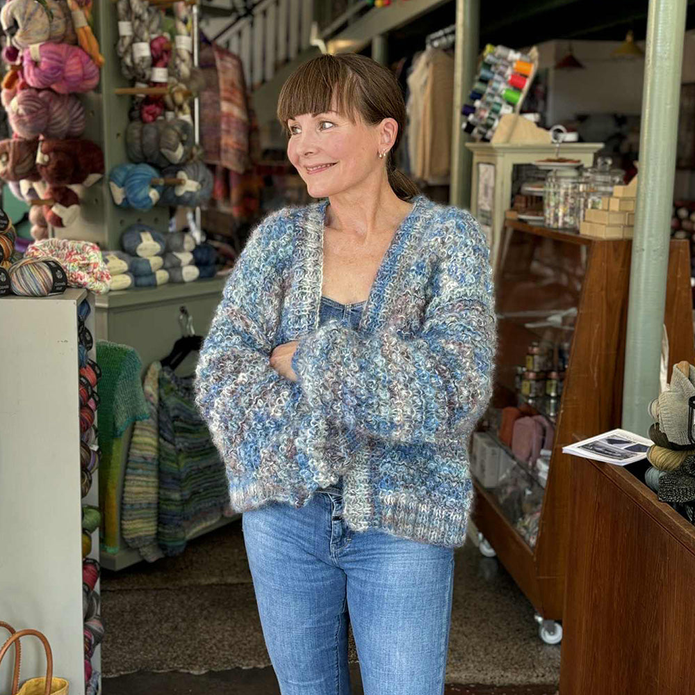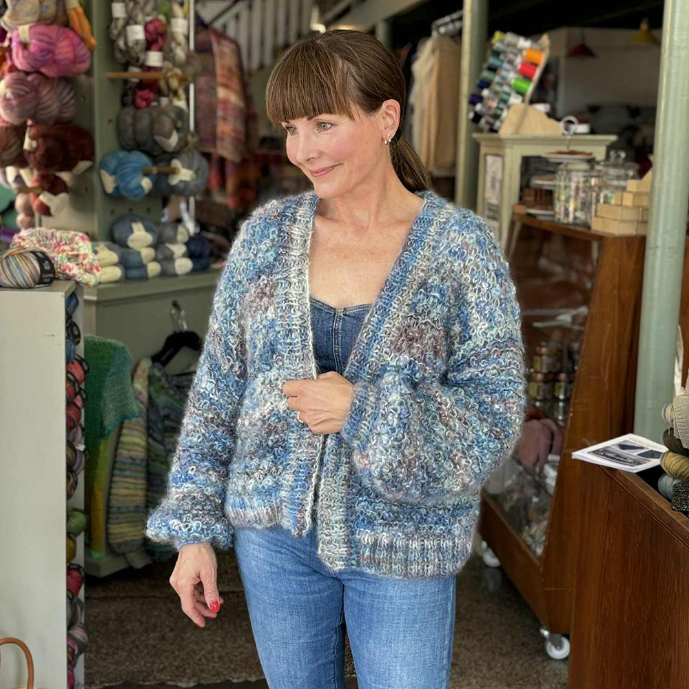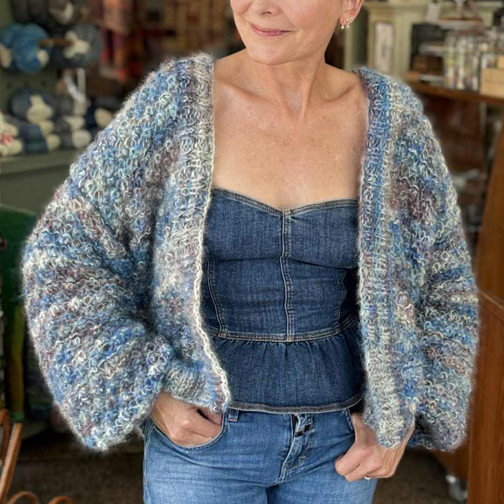 Brombærstrikket cardigan på store pinde. Den er både smuk med selvstribende garn og ensfarvet.